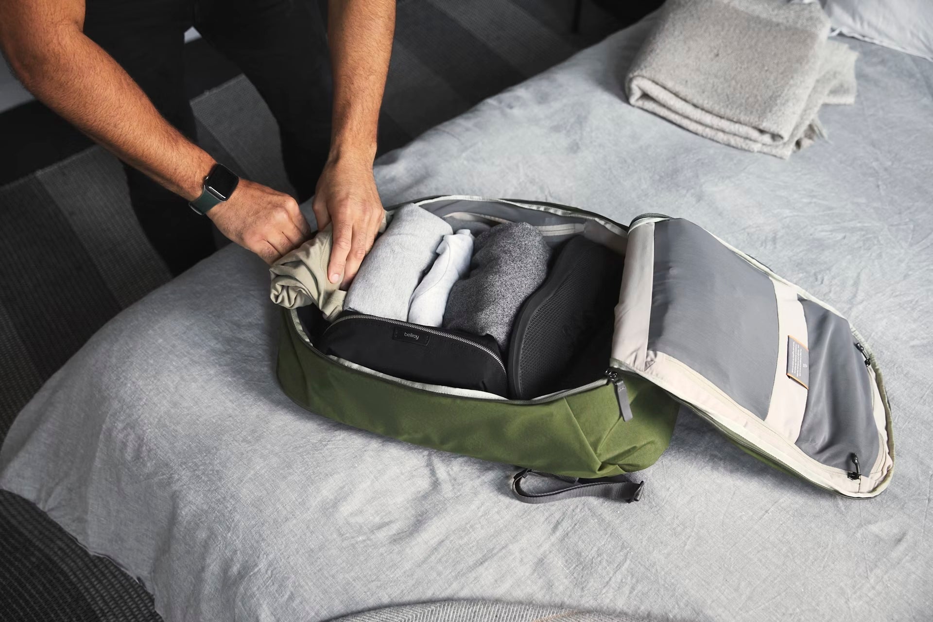 - Dual main compartments for organized clothing and tech storage